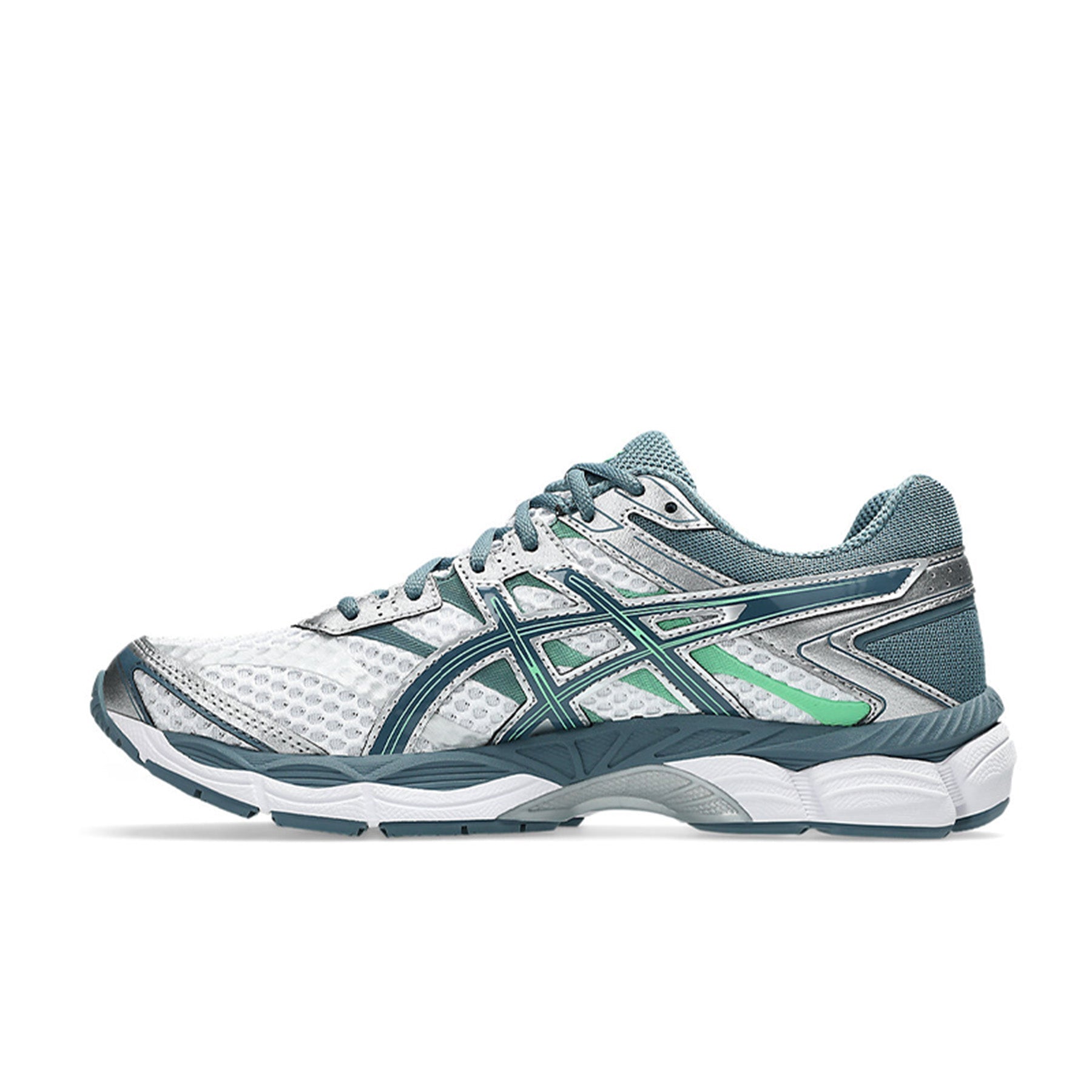 Its upper construction features a combination of glossy synthetic leather overlays, no-sew paneling, and open mesh underlays. This fusion of materials creates a technical aesthetic that's symbolic of advanced running shoes in the 2010s.