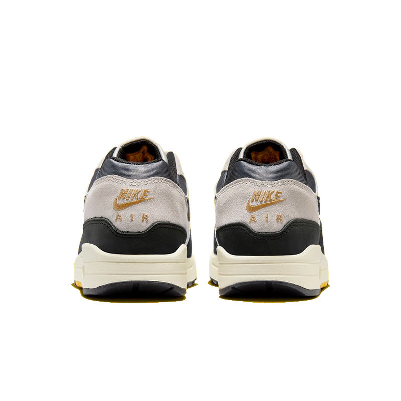The Nike Air Max 1 Athletic Department Light Bone University Gold is an ode to the original Air Max 1 and is designed to have nostalgic varsity vibes. The body of this model is a Light Bone color, while the sole is a mixture of black and gold. The Air Max 1 in Athletic Department Light Bone University Gold has a black and gold sole that sits right next to the cream-colored midsole. The body of this Nike Air Max 1 model comes in a Light Bone color that is made of leather and features black, gray, and white overlays. The Nike Swoosh is in black, and the laces are an off-white color.